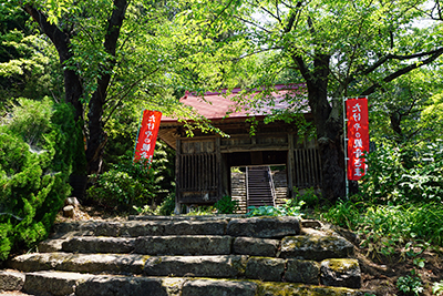 そして、観音堂に戻ると、その近くに「金売吉次・吉内・吉六・三兄弟御堂」と書かれたところに、小さなお堂がありました。案内によると、かつて京都と奥州平泉を行き来して商売をしていた金売吉次と吉内、吉六の3兄弟が、この近くの応湖川を舟で渡ろうとしたときに急な増水で舟が転覆し、吉六が川に投げ出されてしまったそうです。そこで金売吉次と吉内兄弟がここに観音堂を建て供養したといいます。