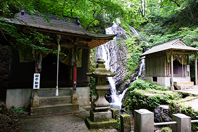 そこから本堂の方へ行き、改めてお詣りし、回廊のところから泊まっている「瀞流の宿 かわち」も見えました。そして、左の階段から下りていくと北山門のところから境内地を出ました。そして一般道を歩くと、本堂の下の崖に大日如来堂があり、祭礼は7月8日と幟旗に書いてありました。