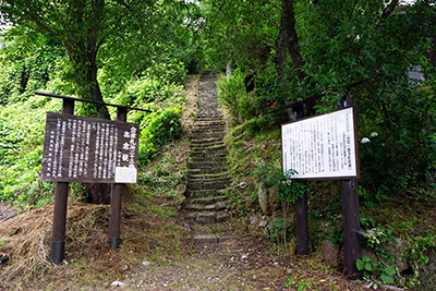 そしてお堂の前に戻ると、左側に田村山史跡保存会の「景勝清水の由来」という案内板が立っていました。そこには、「慶長4年頃、時の若松城主、上杉景勝公がこの地に於て鷹狩りを催せし折り、この清水を味わい、美味なりと大いにこれを賞せられた。その後この清水を里人は景勝清水と呼ぶようになった。」と書いてありました。