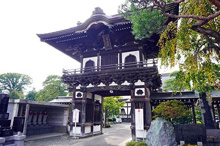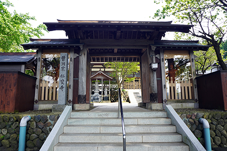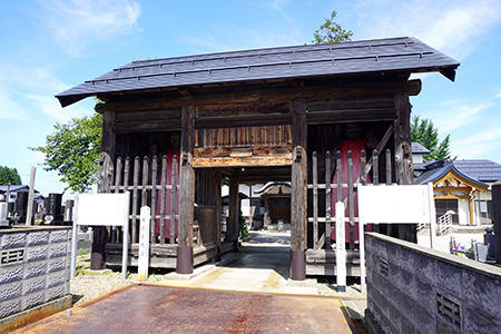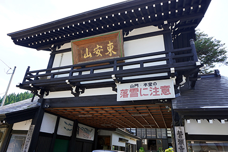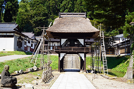 すると、また正面に鐘楼門があり、こちらは1925(大正14)年に建てられたもので、入母屋造りの銅板葺きでした。右側に階段があり、上に登ることもできるようです。ちなみに山門は、1980(昭和55)年の大雪で倒壊し、翌年に再建されたもので、もしかすると「不許葷酒入山」の石塔もそのときに折れたのかしれないと思いました。やはり雪深いところの寺院は、寺域の管理が大変です。