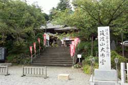 その報国寺を出て、再び金沢街道に出て杉本寺に向かいました。大蔵山をちょっとだけ上り、入山料200円を払い、石段を少し上ると山門があります。その山門をくぐると、擦り減った石段がまっすぐに本堂まで続いています。現在は、この石段では危ないので通行止めになっていて、左の石段(女坂)を上ります。その上りきったところに、第1番札所杉本寺はありました。