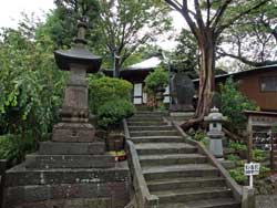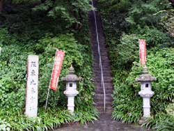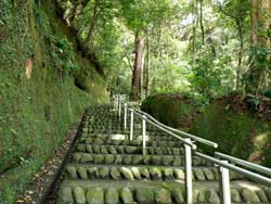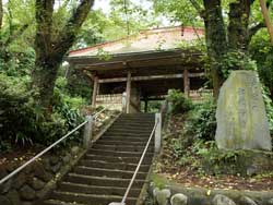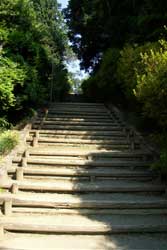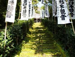 広いアスファルトの道路の脇から急な細長い石段を上ると、その上に観音堂があります。この石段は緑に覆われ、日当たりも悪いので、少し滑りやすく、気をつけてゆっくりと上りました。後から気づいたのですが、別な楽な参道があって、こちらから上ると比較的楽なようです。