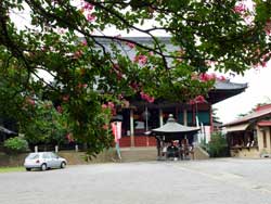 仁王門まえには駐車場があり、少し雨が降っていたので、傘を差しながら写真を撮っていると、ほどなく雨が上がったので、もう一度ゆっくりと写真を撮り直しました。仁王門をくぐり、お堂を見渡すと、その手前に形の良いサルスベリが花を付けていました。花色もありふれたもので、しっとりとした風情が感じられました。また、先ほどまでの雨の水滴がつぼみに付着し、花のつぼみと水滴がともに光って見えました。