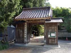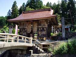 この川は「思川(おもいがわ)」というらしく、この川を渡るとすぐに山門があり、その右手に大きな白御影石の石塔があり、そこには「霊場置賜三十三所第九番 観世音」と書かれていました。山門の大きなわらじは約1メートル50センチほどで、ほぼ中央の山門の通りに一足が懸けられ、その脇にも普通の大きさのわらじがいくつも山門の格子に懸けてありました。この大きなわらじは地区民で10年に一度作られるそうで、昨年新しくされたとのことです。