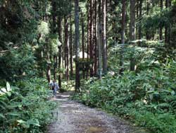そして帰り際にもう一度参道から杉木立を望むと、そのひときわ目立つ大杉に、何ともいえない荘厳さを感じました。やはり、巨樹には霊異が籠もっているように思います。その樹が育ってきた長い年月を考え、それに引き替えこれからの自分たちの短い人生を思うと、その凄さがいっそう感じられます。そこで、再び手を合わせ、この観音堂と杉木立が永遠に人々を見守り続けていただけるようにと祈りました。