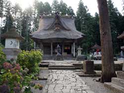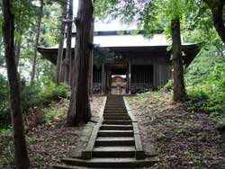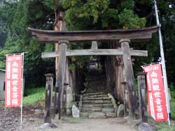 その石段を更に進むと、右にまた石段があり、それを上ると、そらにまた左手に長い石段があり、その先を右に折れると大きな杉の木がありました。その大杉の根元は祠のようになっていて、小さな仏像などが納められていました。聞くところによると、ここの観音堂はもともとコバ葺きでしたが、銅板葺きにするためにここのご神木を2本ほど売ってその建て替え費用に充てたそうです。つまり、それだけ太い杉だったというわけです。その杉の向こうに目指す関寺観音はありました。