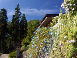 ちょうど参道右手のブロック壁のところに、西洋アサガオの「ヘブンリーブルー」などが植えられていました。ここはブロックだけの殺風景なところなので、今流行のネットを張ってツルを絡ませたのです。それを眺めながら、甲子大黒天本山の大きな唐金製の大黒さまを拝み、さらに上ると、右手に観音堂が見えてきます。まわりには、たくさんのシャクナゲが植えられていて、まさにシャクナゲの中に建っているという感じです。この先は小町山自然遊歩道になっていて、日本のシャクナゲだけでなく、ヒマラヤや中国などのシャクナゲも植えられています。そして、この小町山には1845(弘化2)年と刻まれた「草木供養塔」があります。今年の3月29日に米沢市の有形民俗文化財に指定されました。