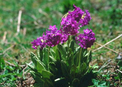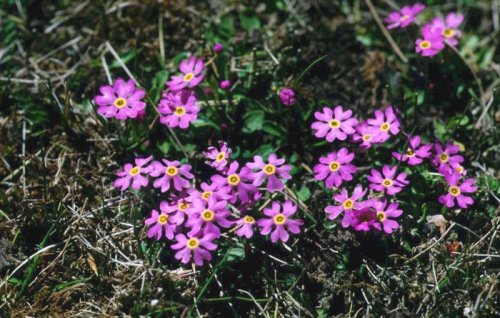 (画像サイズは55.6KB) これは中国雲南省の中甸から四川に向かう街道のわきで撮ったサクラソウです。標高は、3,370mでした。ここは放牧地なのですが、群生しているのはサクラソウに毒性分があるので食べ残されたということです。(1997.05.15) |
