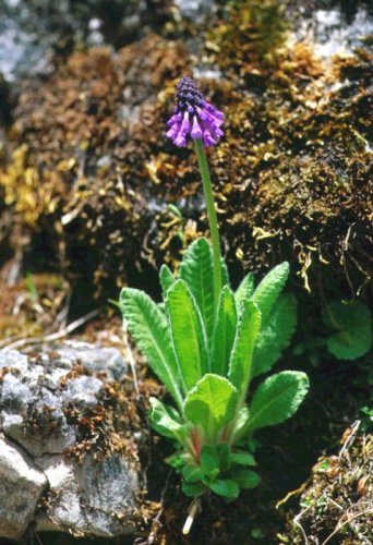 (画像サイズは53.5KB) これは雲南省の中甸の仙人洞と呼ばれているところで撮影しました。標高は、3,350mでした。学名はおそらく Primula muscarioides で、中国名を「圓錐穂花報春」というのも、何となくうなづける感じで、さわやかな青紫色の花が咲いていました。(1997.05.16) |