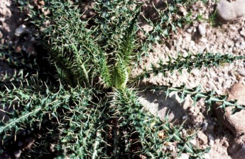 (画像サイズは66.6KB) これも上記と同じ場所で撮影したアザミの仲間です。これは、渓谷に入る前の野原で撮ったものですが、その大きさとトゲトゲしさにびっくりしました。(1988.05.09) |