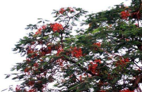 (画像サイズは58.9KB) これは、インドの首都ニューデリーの「Ashok Hotel」の庭で撮影した鳳凰木です。この庭には野生のリスがたくさんいて、しかも人間を見てもビクつく様子もなく、元気にこの木に上って遊んでいました。(1988.05.09) |