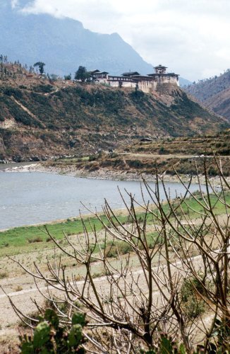 (画像サイズは56.5KB) これはサンコーシュ川と向こうの小高い台地に建つウォンディポドンのゾンを撮りました。ここの標高は1,200mですから、まさに亜熱帯の気候で、よく見るとウチワシャボテンが写っています。この川の近くに寄ってみると、その色はエメラルドで、白い砂との対比がとてもきれいでした。(1986.04.15) |