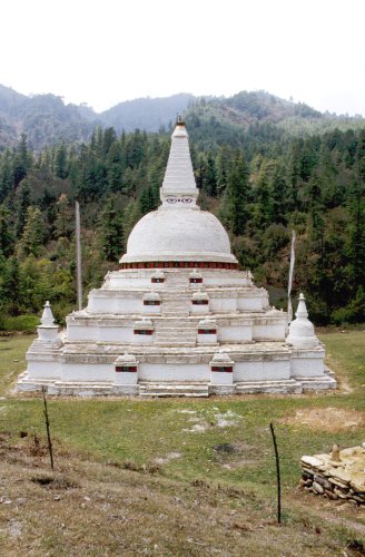 (画像サイズは46.1KB) これはブラックマウンテンと呼ばれる山々を横切るペレラ峠(3,350m)を越えて40分ぐらい車で走ったところにあるチェンデブジ・チョルテン(仏塔)です。この仏塔はこの国では珍しいネパール様式の本格的なもので、上の覆鉢の上に目玉が2つこちらを向いています。(1986.04.20) |