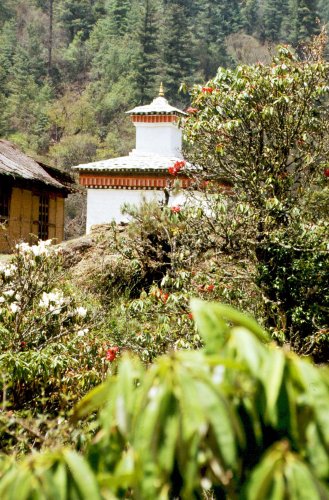 (画像サイズは67.3KB) これはチェンデブジ・チョルテン脇の寺院で、このあたりにはシャクナゲがたくさん咲いていました。チェンデブジとは地名で、このペレラ峠に住み着いていた悪霊を退治したインドの高僧を記念して建てられたということでした。写真では分かりませんが、この手前に小さな川が流れており、その付近には特に珍しいシャクナゲがありました。(1986.04.20) |