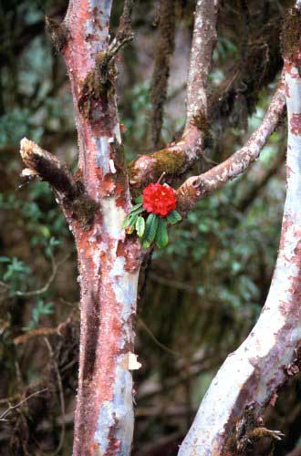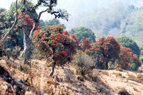 これはドゥールから少し上ったところで、標高は 2,790m のところで撮影したアルボレウム(arboreum)の林の中です。こんな大木ですと、下からではほとんど花を見ることはできません。(2000.03.31)