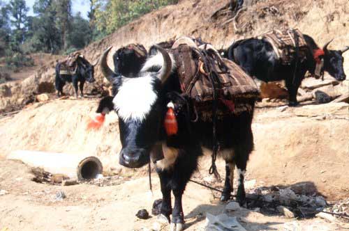 これは牛とヤクの交配種で「ゾーリ」といいますが、出会った中には牛に近いものからヤクに近いものまで、いろいろとあるようです。(2000.03.31)