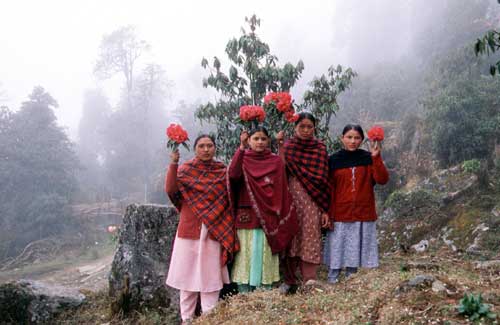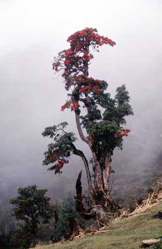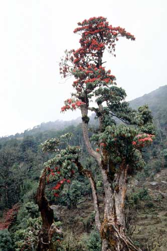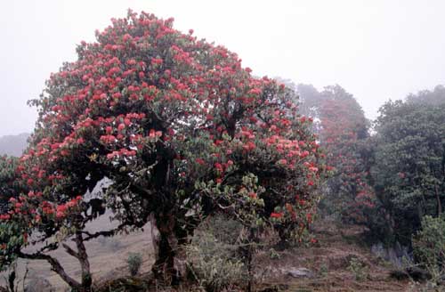 今回は、2001年の4月に、ネパールのシャクナゲ自生地を訪ねたときの写真です。ネパールには30種類のシャクナゲが確認されていますが、ネパールの国花=アルボレウム(ネパールではラリグラスといいます)はさすがに多く自生していました。そのシャクナゲ自生地は、世界でも有数の規模だと思います。しかし、その自生地が少しずつ減少しているのも事実です。