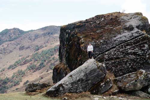 ここはミルケダンダと呼ばれているところで、すごく大きな石がありました。ちょっと危なっかしかったのですが、この大きさを伝えたくて何とか登ってみました。(2001.04.15)