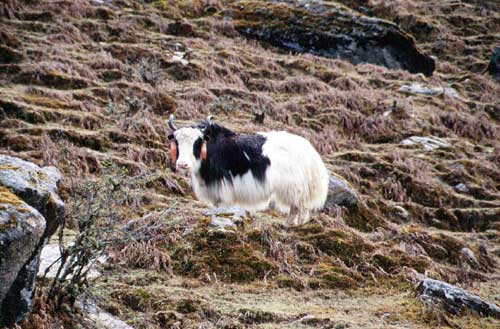 ミルケダンダではヤクの放牧が行われており、その中にたった一頭だけ白っぽい毛のヤクがいました。遠くからでも目立つので、ヤクにとっては嫌だろうなと思いました。(2001.04.15)
