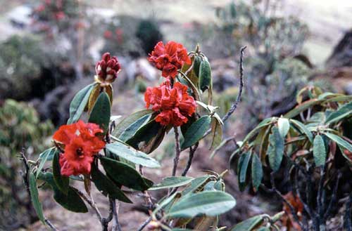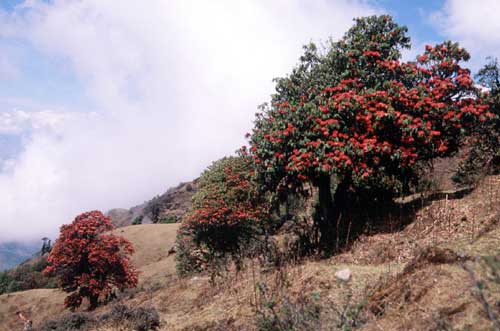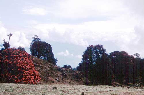 これは、ミルケダンダを進む途中で見つけたアルボレウム(R.arboreum)の真っ赤な個体です。特に右手前の株が花も葉も良いようでしたが、黒いスポットは強烈でした。(2001.04.15)