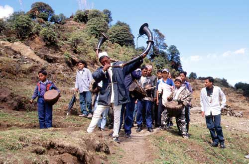 偶然というか、ネパールではちょうど正月だったので、村々をまわる楽隊(日本風にいえば獅子舞のような)に出会いました。その大きなラッパの音が、ヒマラヤの山々にこだましました。(2001.04.15)