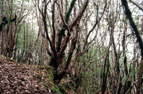 バーバタム(R.barbatum)の林の中で、花がどこに咲いているかわからないくらい背の高いものでした。でも、その赤茶けた樹皮のむけやすいつるつるとした幹肌は、紛れもなくバーバタムそのものでした。(2001.04.15)