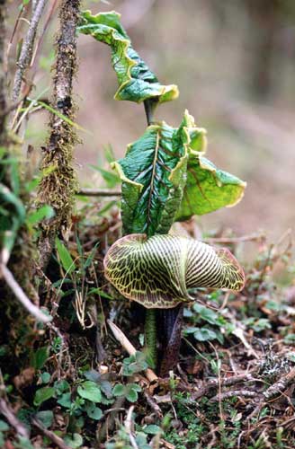 これは、あの有名な象の耳と呼ばれているテンナンショウで、griffithiiという学名です。ブータンのある峠でも見ましたが、その強烈な個性が光る植物の一つです。(2001.04.15)