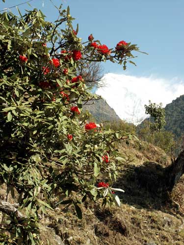 (画像サイズは44.4KB) ここはヒレから歩いて吊り橋を渡り、そこから急斜面を上ったところで、最初のシャクナゲ(R.arboreum)を見つけました。山々に挟まれたように見える雪山は、アンナプルナ・サウスです。2日がかりで上って、最初に見えた山です。(2002.03.05) |