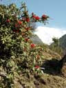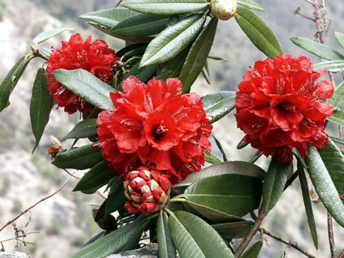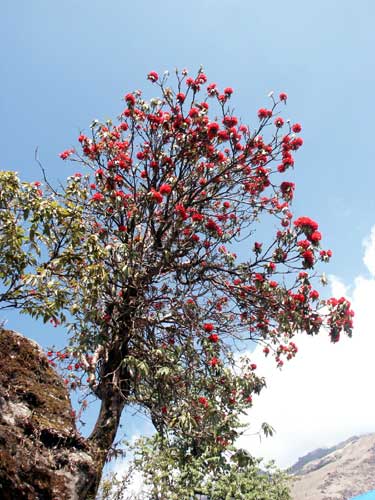 (画像サイズは44.1KB) 上記とほぼ同じところで撮ったものですが、花の色はほとんど変わりありませんでした。真っ赤な花で、ブロッチもほとんどなく、花形もすっきりとしていました。なんといっても、ヒマラヤの青空にこれほど似合う花はないと思います。(2002.03.05) |
