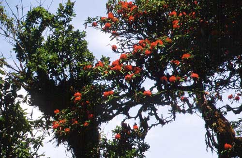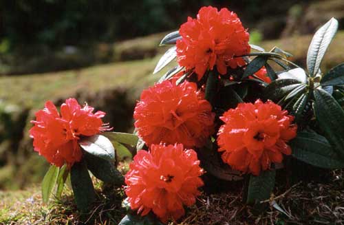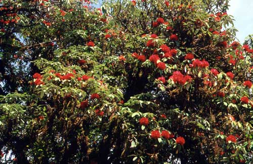 (画像サイズは41.4KB) これはポタナの手前で撮ったシャクナゲですが、このあたりはほとんどがアルボレウム(R.arboreum)で、花色の変化もほとんどありませんでした。近づいてみると、上記のようなシャクナゲばかりのようです。(2002.03.09) |