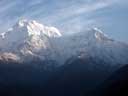 (画像サイズは11.6KB) そのトルカの夜が明け、翌日には素晴らしいアンナプルナ南峰が朝日に照らし出されました。テントから顔だけ出して写真を撮り、次ぎにティーを飲みながら外で写真を撮り、そして、この山も今日で見納めだと思うと、何度もシャッターを押してしまいました。(2002.03.09) |