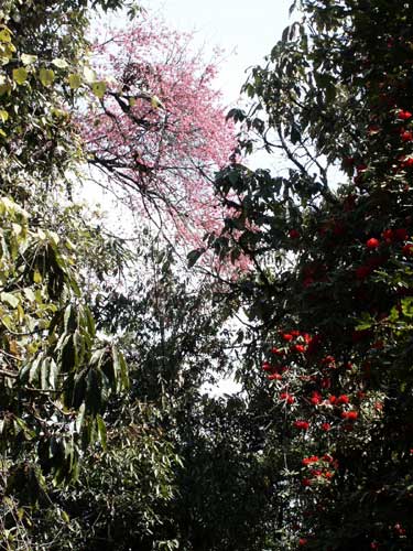 (画像サイズは55.3KB) これはディオラリ(Deurali)を過ぎたあたりで撮ったものですが、シャクナゲの林の中にやけに目立つ花木がありました。ちょっと遠くて種の確認はできませんでした。このあたりは尾根沿いの道で、とても歩きやすかったです。(2002.03.09) |