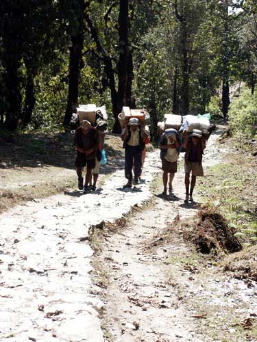 (画像サイズは45.8KB) これも、ディオラリ(Deurali)を過ぎたあたりのとても歩きやすい道です。村人たちが大きな荷物を背負って歩いていました。おそらく、50Kgは越えているのではないかと思いました。でも、声をかけると陽気な挨拶が返ってきました。(2002.03.09) |