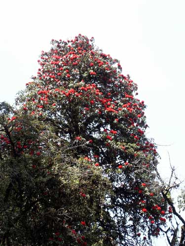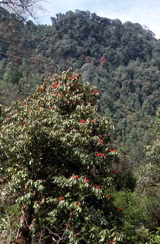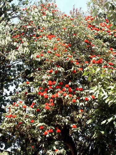 (画像サイズは40.6KB) これはディオラリ(Deurali)付近で撮ったアルボレウム(R.arboreum)の大木です。このあたりのシャクナゲは、ほとんどがこのタイプで、花色の変異もあまりなく、葉裏の毛も薄いものでした。(2002.03.09) |