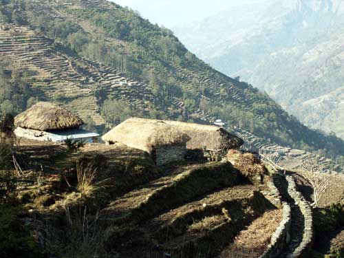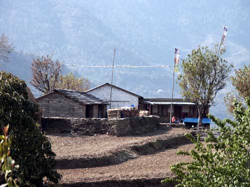 (画像サイズは34.1KB) これはダンプス(Dhampus)の村に入ってすぐに撮ったものです。ここは仏教徒が多いらしく、あちらこちらにダルチョ(祈願旗)が立っていました。ここは耕作地も整然としていて、豊かな村という感じでした。(2002.03.09) |