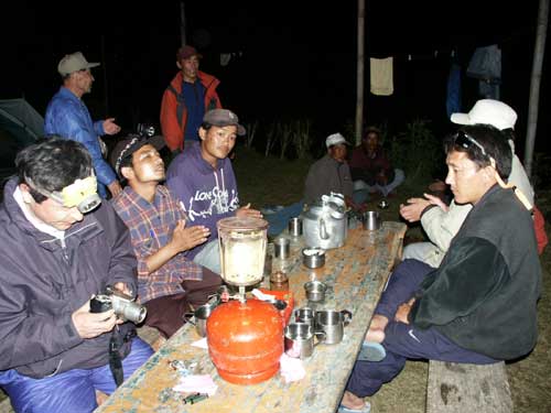 (画像サイズは30.1KB) これはポーターたちの場所で、やはり大いに飲んで、大いに食べてもらいました。でも、その区別は厳然としてあるらしく、その間にはヒマラヤの厳しい風がひゅーひゅーと吹いていました。(2002.03.09) |