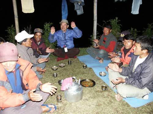 (画像サイズは27.3KB) この日が、山での最後の夜でした。そこでお世話になったシェルパやポーターたちに、お酒を振る舞いました。ガイドやシェルパたちは私たちといっしょに飲めや歌えの大騒ぎでした。(2002.03.09) |