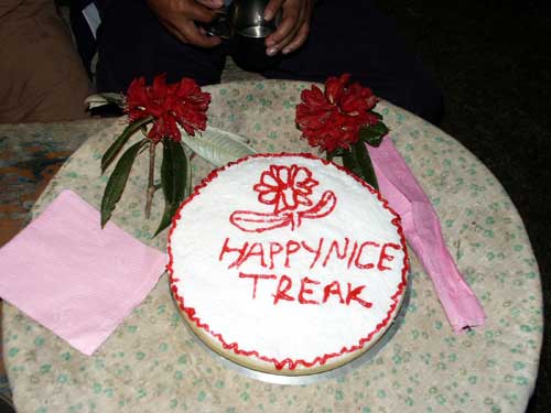 (画像サイズは24.8KB) これが、コックのプルナのお決まり、最後の夜のケーキです。しかも、シャクナゲの生花を添えて、無事にトレッキングができてよかったね、というお祝いのケーキです。みんなで、美味しく食べました。(2002.03.09) |