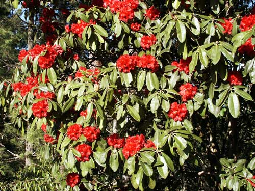 これは、2002年3月にネパールのシャクナゲ自生地を訪ねたときの写真です。ネパールには30種類のシャクナゲが確認されていますが、ネパールの国花=アルボレウム(ネパールではラリグラスといいます)はさすがに多く自生していました。そのシャクナゲ自生地は、世界でも有数の規模だと思います。しかし、その自生地が少しずつ減少しているのも事実です。