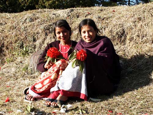 このエリアでは、シャクナゲが道路沿いにもあり、まったくありふれた植物の一つです。だから、彼女たちも花を採っては何気なく遊んでいました。周りには、その花びらが散らかっていました。(2002.03.13)