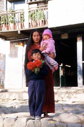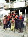 (画像サイズは33.2KB) これは、同行したガイドとドライバーが宿泊した近くのシェルパ族の子供たちです。道のすぐわきにもシャクナゲがたくさん咲いているので、子どもたちが手に手にシャクナゲを持ってポーズをとってくれました。(2002.03.14) |