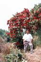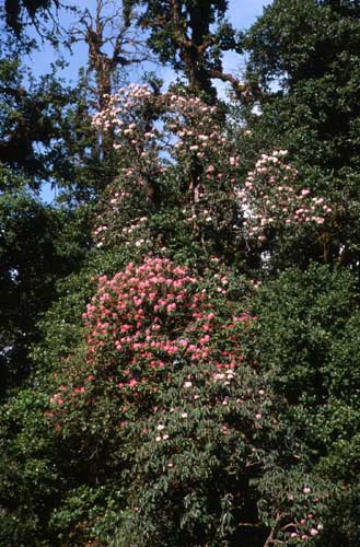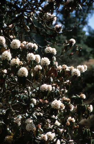 (画像サイズは31.6KB) 上記のところから、道なき道を下って行ったところで見つけた白花のアルボレウム(R.arboreum)です。この花は純白で、近くにもこれだけの木はなく、小さな株を探しましたがありませんでした。高さは約5mほどでした。(2002.03.14) |