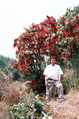 (画像サイズは40.9KB) これは、また宿泊したところに戻ってきて、朝食を食べる前にガイドさんとシャクナゲを撮ったものです。この木は、木姿から見ても、似たような木がたくさんあることからしても、おそらく近くから掘ってきて植裁したものだと思います。さすがに、ここは適地なのか、順調に育っていました。(2002.03.14) |
