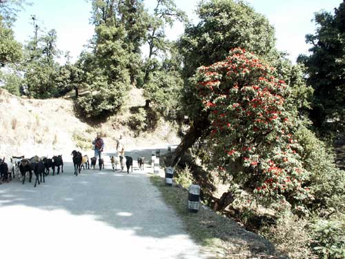 (画像サイズは45.0KB) これは、シャクナゲを見ながら道を歩いていると、ヒツジを連れた村人に出会いました。こんなにたくさんあるシャクナゲのどこが珍しいのかと不思議な顔をしていました。(2002.03.14) |