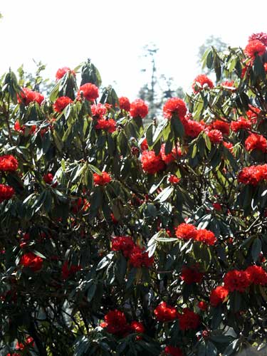 (画像サイズは48.3KB) これは、アルボレウム(R.arboreum)です。私が泊まった付近のエリアのシャクナゲは、ほとんどがこのタイプですが、朝日に強く照らし出されて、とてもキレイに見えました。花色も葉姿もその他の特徴もほとんど変化はないようです。(2002.03.14) |
