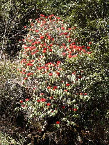 (画像サイズは61.7KB) 道の下のヤブになったところで見つけたアルボレウム(R.arboreum)ですが、この木で高さが3mほどです。道を通るヒツジやウシなどもシャクナゲは食べないので、すくすくと育っています。(2002.03.14) |