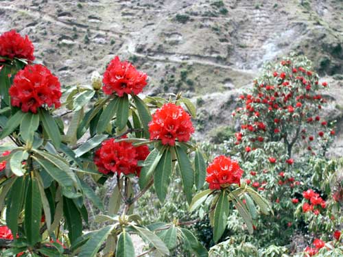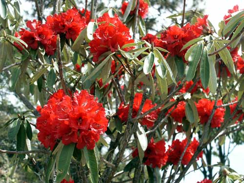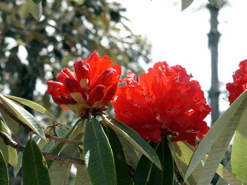 (画像サイズは34.0KB) そのすぐわきにあったアルボレウム(R.arboreum)ですが、ブロッチはないのですが、黒々とした蜜腺はありました。花形も大きく、ブロッチが気になる方にも喜ばれるのではないかと思います。(2002.03.14) |