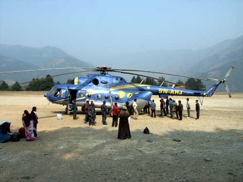 (画像サイズは21.7KB) ここはファプルの飛行場です。この日は風が強く、飛行機が飛べないので、カトマンドゥからヘリコプターでここまで来ました。その間、約30分ほどでしたが、その騒音のひどさにビックリ。それでも砂利道の滑走路に着陸するよりもマシでした。(2004.04.01) |