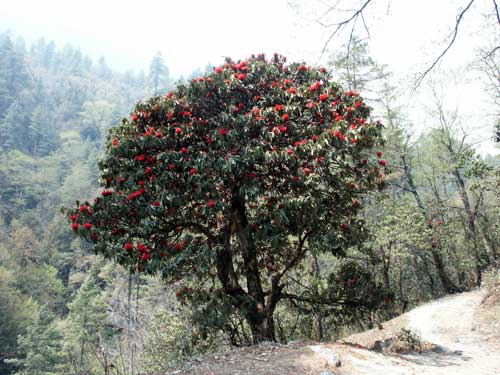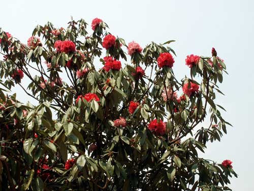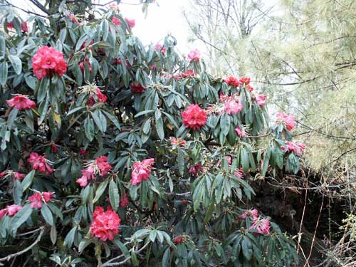 (画像サイズは48.1KB) この日最初に出会ったシャクナゲ(R.arboreum)です。花色が真っ赤でないのがちょっと気になりましたが、すでに咲き散り始め、鑑賞するというよりは第一歩の記念という感じでした。(2004.04.01) |