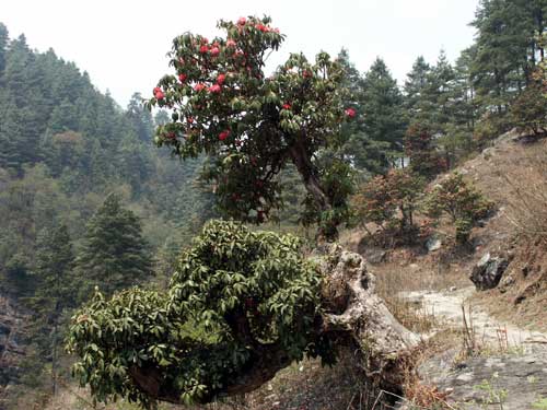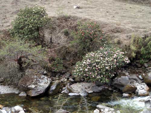 (画像サイズは40.2KB) ジュンベシ川のほとりのシャクナゲです。望遠レンズで撮影したので、ちょっと分かりにくいですが、やはり花色は薄いということだけは分かると思います。この川をさかのぼったところにジュンベシがあり、この日はそこにキャンプしました。(2004.04.01) |